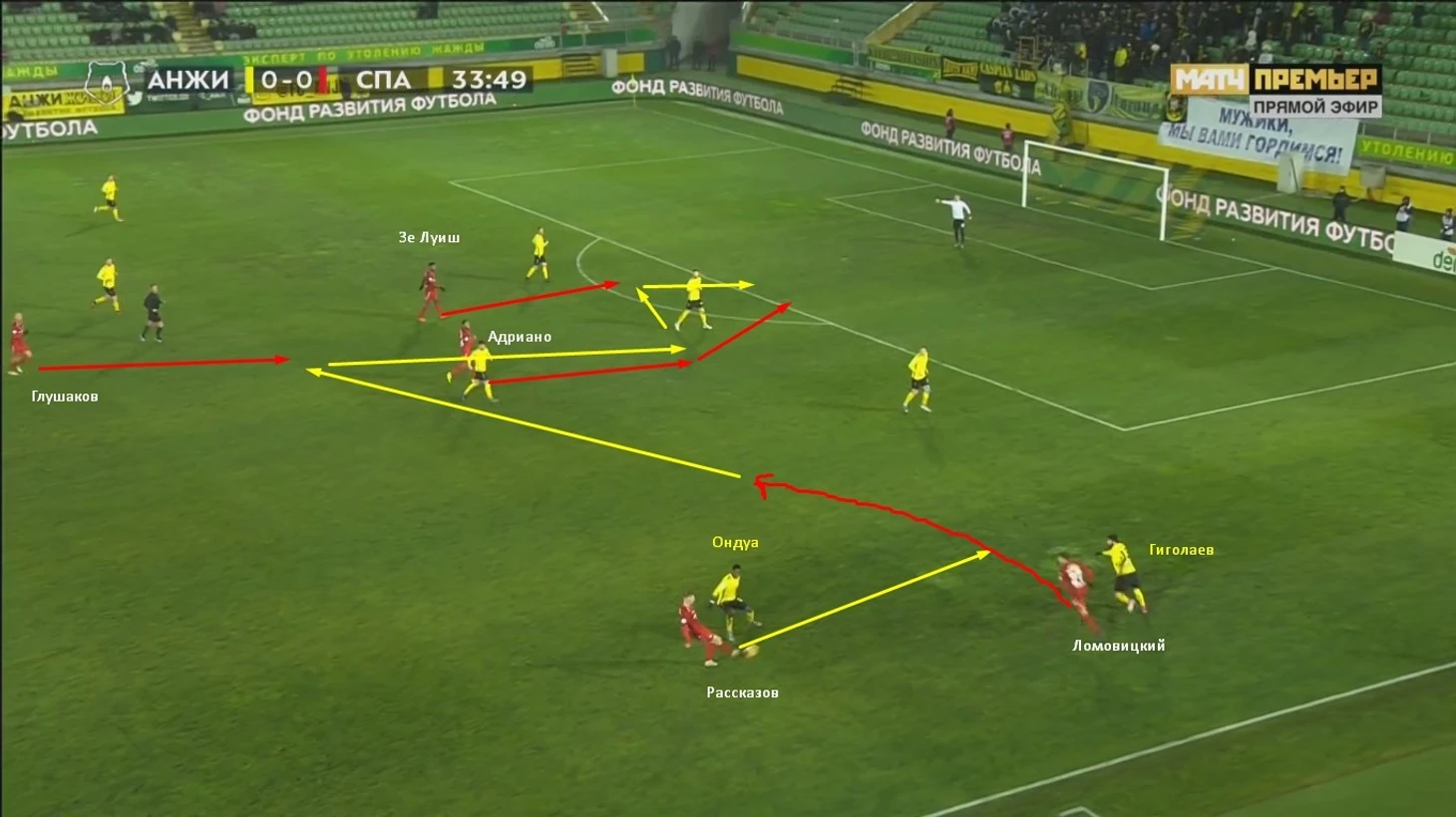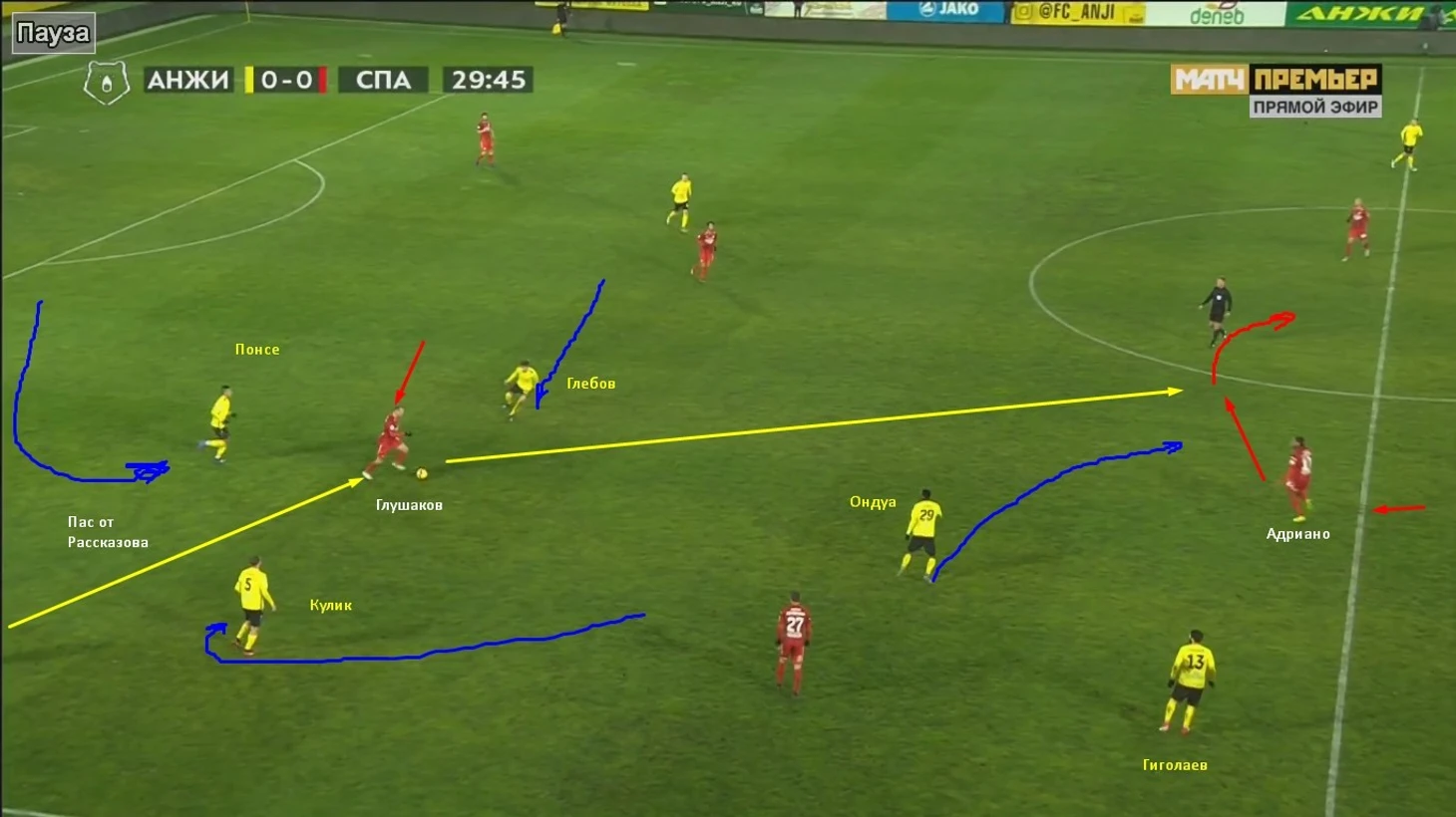Идём на правый фланг. Ломовицкий делает ширину - Гиголаев идёт за ним, а Рассказова пытается накрыть Ондуа. Но камерунец не успеет перехватить мяч и пас проходит на Александра. Тот смещается в центр и отдаёт на Глушакова. Дальше передача на Адриано и попытка сыграть в стенку с Зе Луишем. Однако тут Новосельцев успеет помешать приёму: