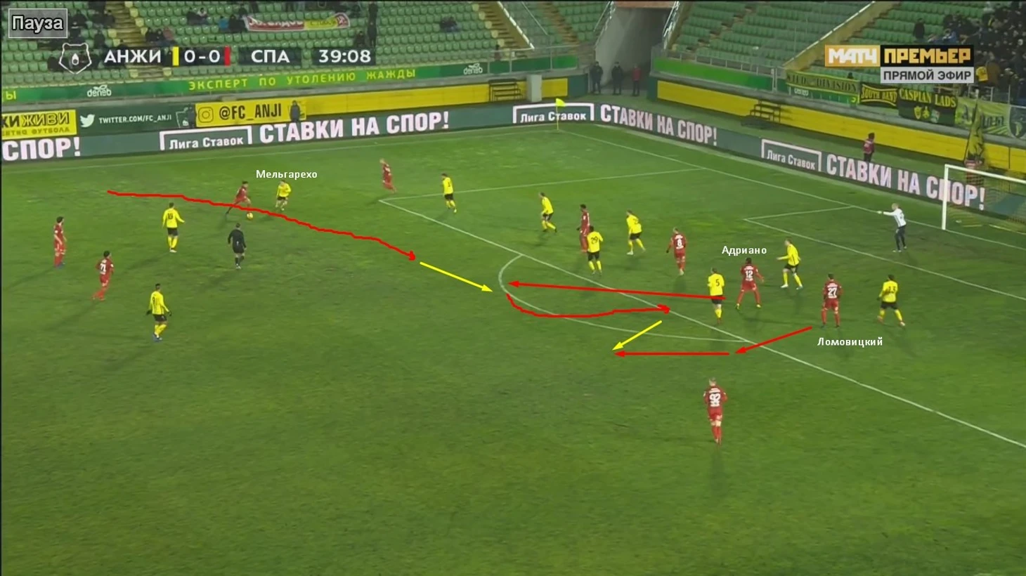 Ещё вариант вскрыть оборону через смещения в центр фланговых игроков. Тут Мельгарехо движется к центру. Адриано оттягивается вглубь, получает передачу. В это же время назад отходит Ломовицкий. Бразилец начинает двигаться с мячом к штрафной и даёт скрытый пас назад под удар Ломовицкому. Вновь неточно: