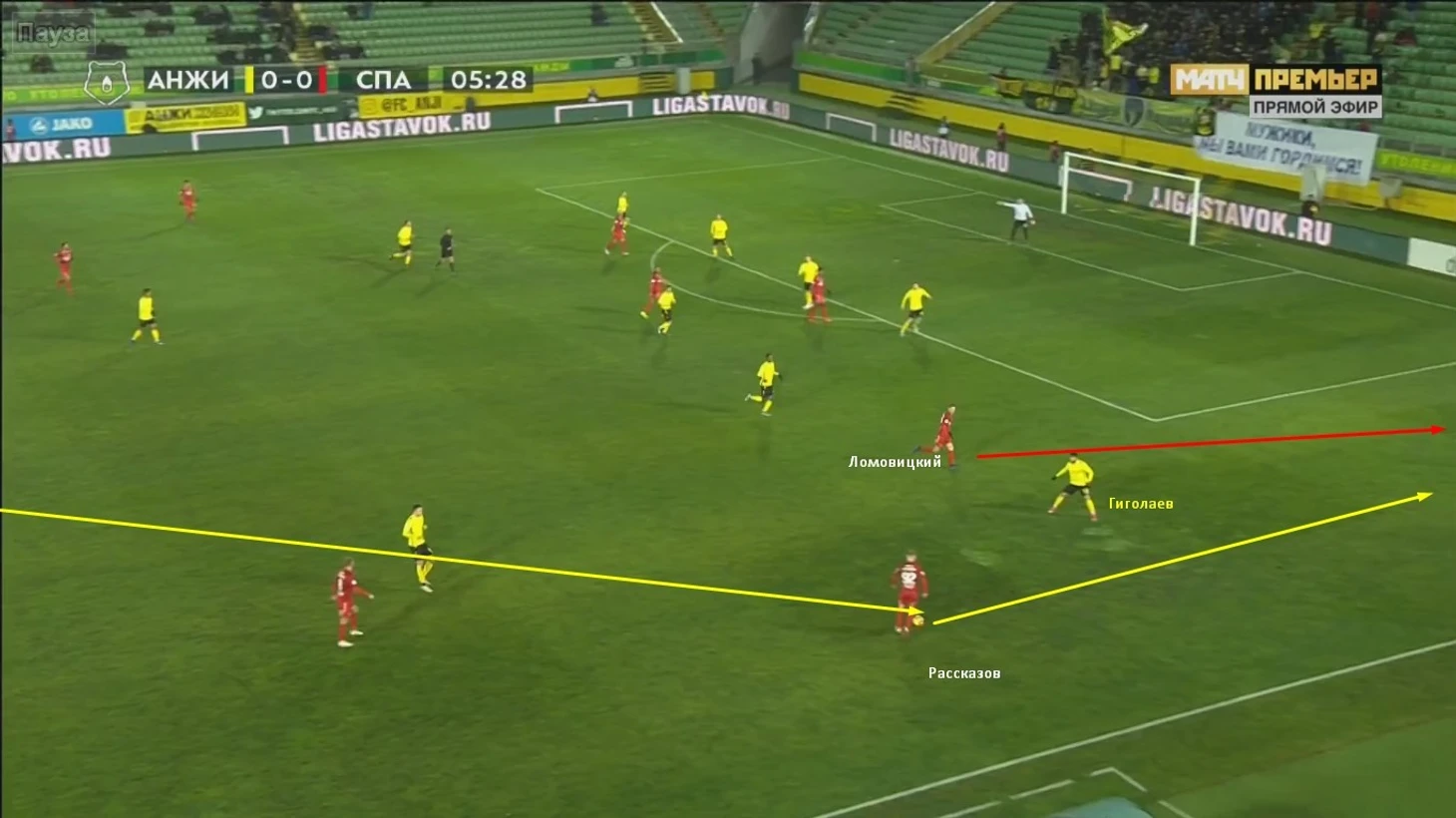 Вот здесь идёт длинная передача на Рассказова, который тут же отправляет мяч за спину Роланду Гиголаеву на Ломовицкого: