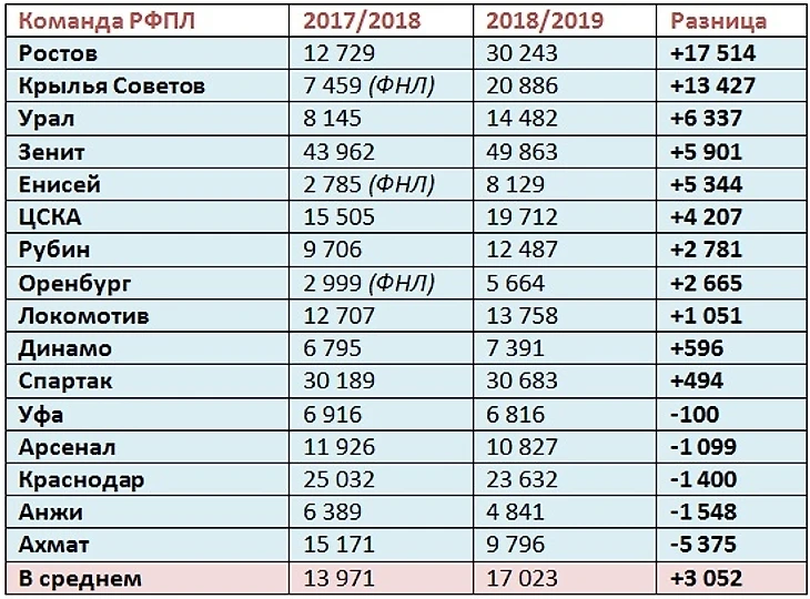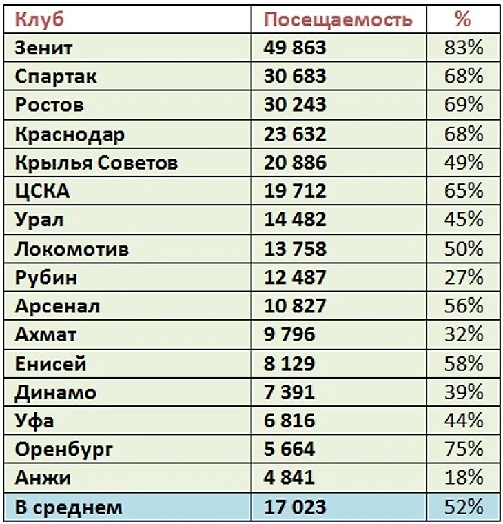 Средняя домашняя посещаемость клубов РПЛ, после 17 тура: