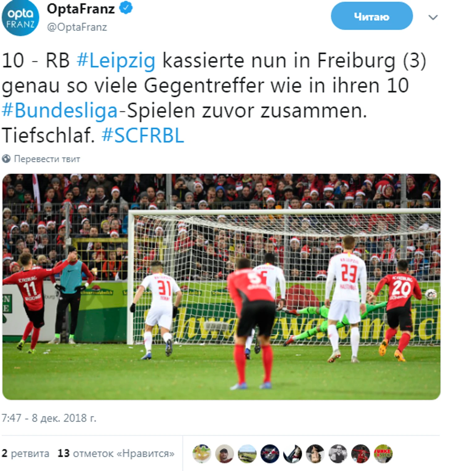 Во Фрайбурге произошла самая большая неожиданность тура. Впрочем, в последнее время матчи «быков» проходят по принципу «Кто первым забьет, того и тапки» — в последних 12 матчах ставка «Обе забьют» прошла бы всего один раз. В этот раз первыми отличились хозяева — Петерсен хорошо сыграл на добивании. И вот тут выяснилось, что с нынешним «РБ» достаточно просто отойти назад и отдать мяч — против такой тактики рецепта у Рангника нет, команда при отсутствии пространства и возможности играть на контратаках скисает.