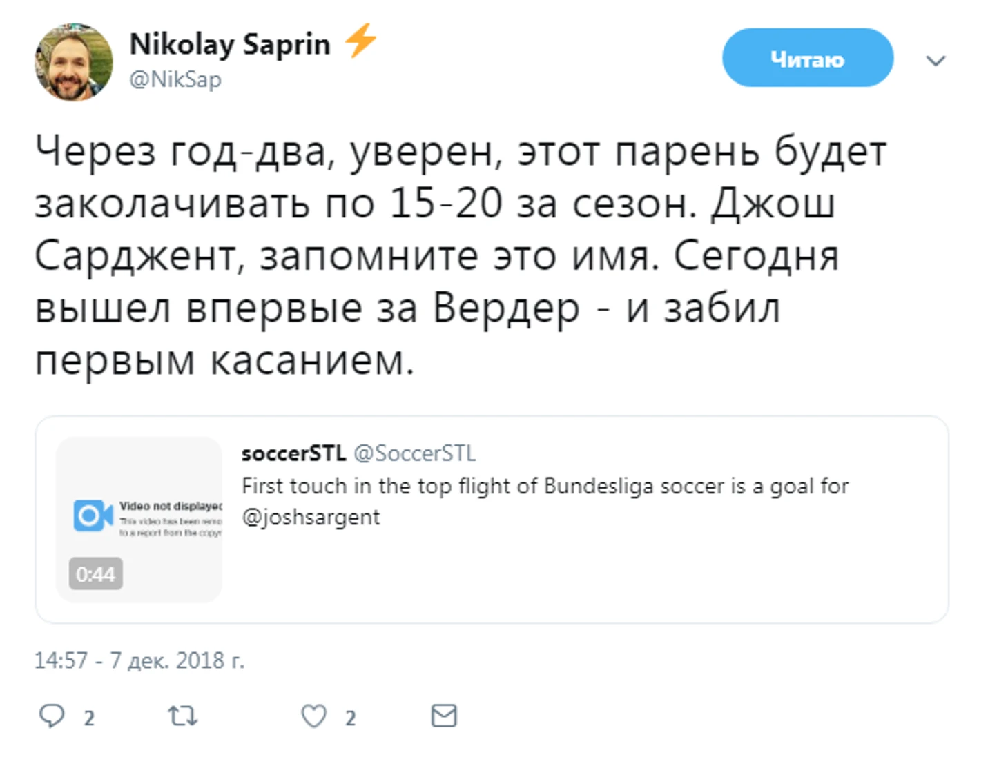 Во втором тайме поначалу игра шла в обе стороны, но в итоге у «музыкантов» сработали замены - сначала Харник добил мяч после дальнего удара, а потом на сцену вышел 18-летний американец Сарджент. Парень первый раз вышел за основную команду, но до этого успел забить 7 раз в 7 играх за резерв, а еще сыграть за взрослую сборную США и забить перуанцам. И тут ему понадобилось всего 2 минуты, чтобы отличиться. 3:1 - в целом заслуженная победа «Вердера», но с такой игрой в защите команде будет тяжеловато чего-то достичь.