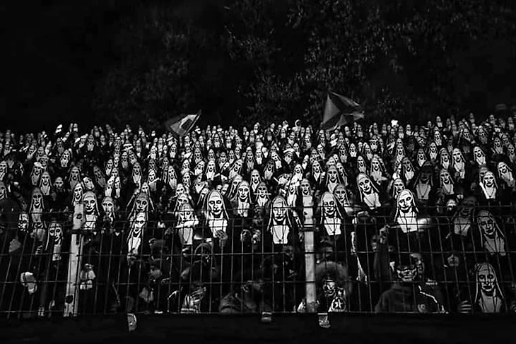 Дополняло картину море масок этой же монахини, которые фанаты, находящиеся на заворотной трибуне стадиона Болгарской Армии, нацепили на себя: