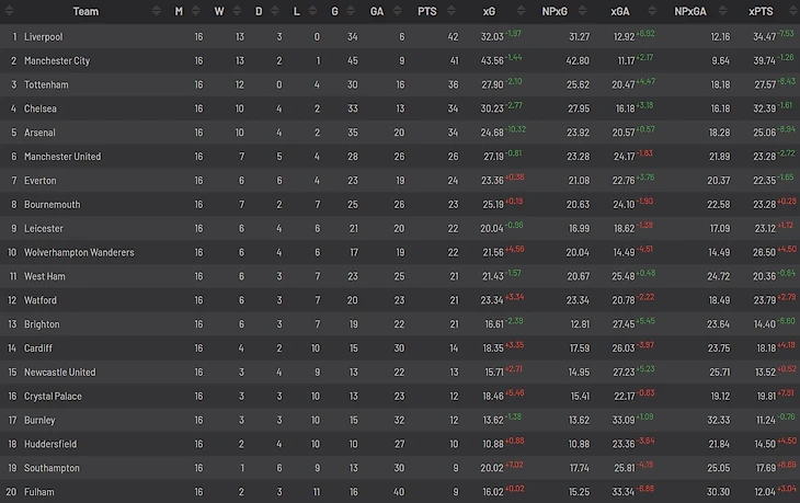 Таблица xG после 16 туров АПЛ (М - кол-во матчей, W - кол-во выигрышей (фактических), D - кол-во ничейных исходов, L - кол-во поражений, G - кол-во забитых, GA - кол-во пропущенных, PTS - кол-во очков, xG - кол-во созданных моментов xG (цифра рядом - соотношение с забитыми голами), NPxG - то же самое, но без учёта пенальти, xGA - кол-во допущенных моментов xG, NPxGA - то же без пенальти, xPTS - кол-во очков по системе xG)