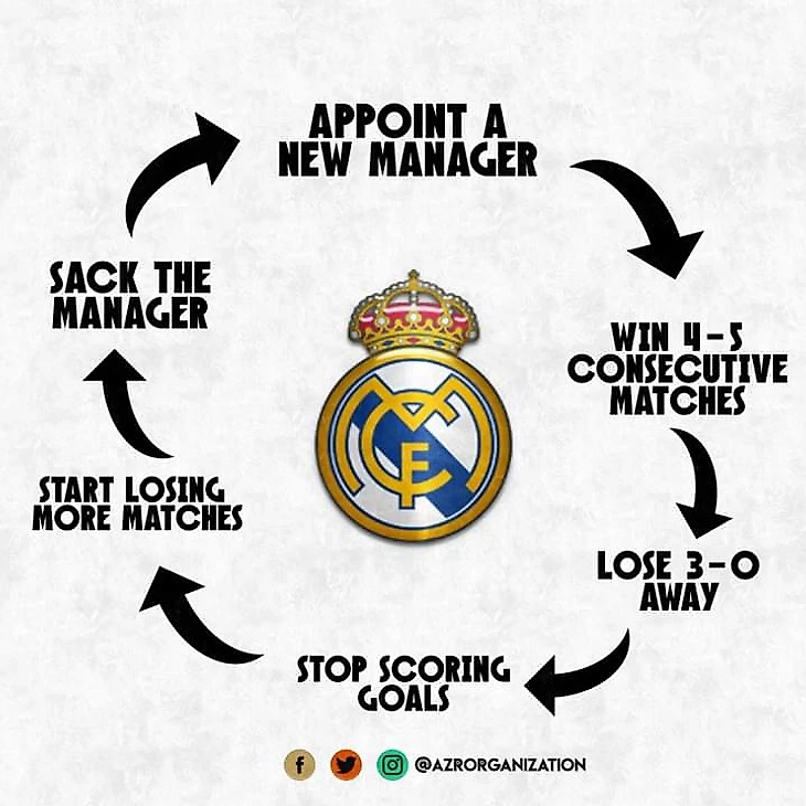 Пригласить нового тренера - Одержать 4-5 побед в стартовых матчах - проиграть 3:0 на выезде - перестать забивать голы - начать проигрывать ещё больше матчей - уволить тренера - пригласить нового тренера...