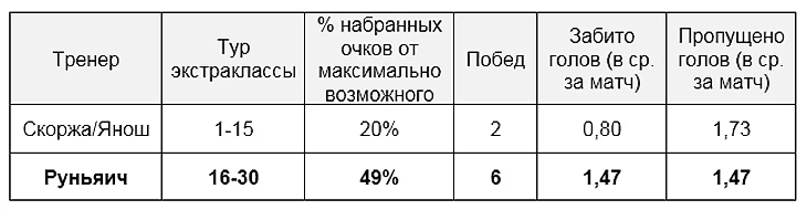 После зимней паузы «Погонь» Руньяича выдала серию 4В-2Н-3П, где все три поражения имели болезненный окрас с убийственной разницей мячей 0:8. Тем не менее, Коста поднял команду с 16-го на 11-ое место, повторив свой дуйсбургский подвиг спасителя образца сезона 2012/13. Успех Руньяича, назначенного аккурат по окончании первого круга чемпионата, гораздо заметнее на фоне результатов команды до прихода немецкого специалиста в стан «гранатово-бордовые»: