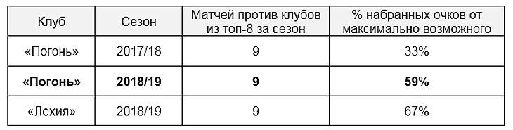 Начиная с сезона 2013/14, «Погонь» набирала в среднем 48 очков (43% от максимально возможного), что для чертовски конкурентной и непредсказуемой Экстраклассы неординарное достижение. Правда, тут не обойтись без ложки дёгтя, на финальном этапе топ-8 «гранатово-бордовые» набирали за 7 матчей в среднем жалкие 4 очка (18%), но летом 2017 подобный момент не смущал в свете следующего факта.