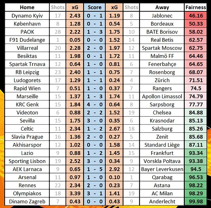 Как видим, самым несправедливым (с точки зрения модели xG) результатом стало домашнее поражение киевского "Динамо" от ФК "Яблонец" со счетом 0-1.