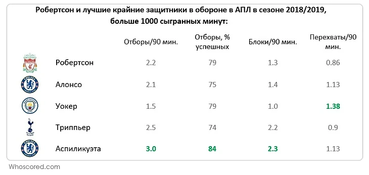 Для Клоппа было важно, чтобы помимо полезных атакующих действий фуллбэки успевали помогать сзади, в обороне. В первой половине прошлого сезона у Клоппа были с этим проблемы – слева в защите из раза в раз привозил Морено, а правый защитник Гомез поднимался слишком высоко, очень часто упуская своих противников на фланге. Тогда Клопп элегантно решил проблему, попросив Гомеза оставаться ниже. Во второй части сезона к команде присоединился Ван Дейк и Робертсон стал чаще попадать в состав, что сделало команду намного более надежной в защите. Оборонительно цифры Робертсона в этом сезоне тоже впечатляют – статистически он чуть хуже лучших фуллбэков лиги даже несмотря на то, что «Ливерпуль» по времени сильно меньше обороняется в этом сезоне, чем «Челси» или «Тоттенхэм». Но даже при этом шотландец смотрится очень хорошо, по оборонительным цифрам заметно уступая только правому защитнику «Челси» Аспиликуэте: