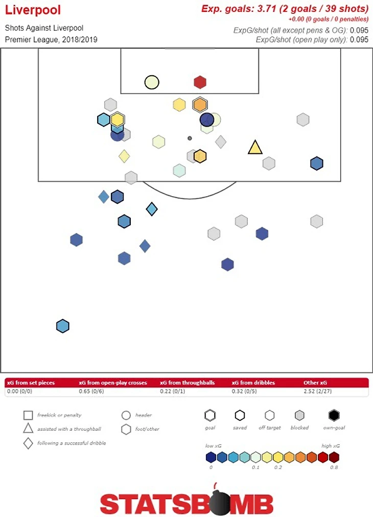 Соперники знают о том, что Робертсон надежен, и предпочитают атаковать через противоположный фланг: во-первых, там находится молодой Александр-Арнольд, которому пока недостает стабильности, а во-вторых, над молодым защитником находится Салах, который редко опускается в оборону. Здесь интересно посмотреть карту ударов по воротам «Ливерпуля» в начале сезона – на ней отлично видно, как мало получается у соперников мерсисайдцев во время атак слева. Все удары оказываются либо малоопасны, либо заблокированы: