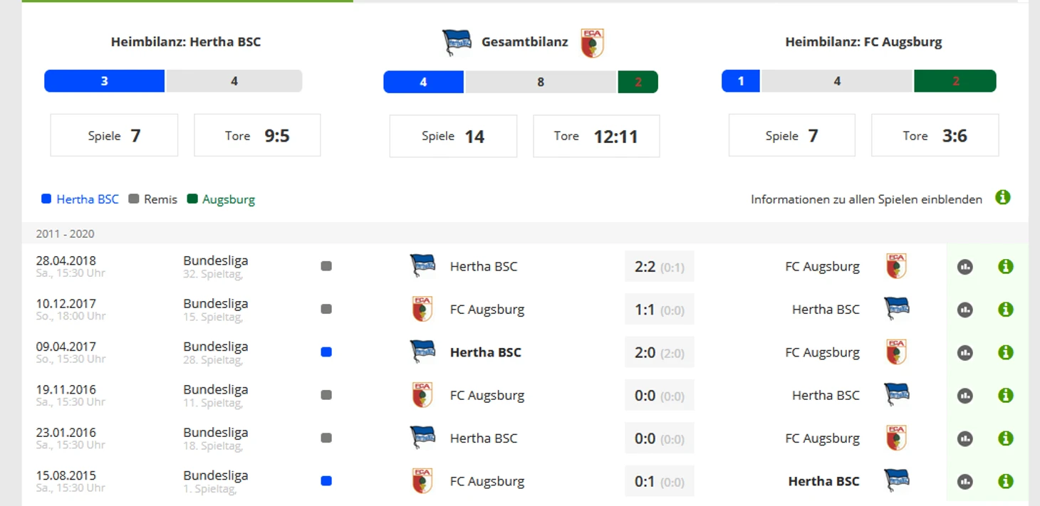 На олимпийском стадионе в Берлине сыграют «Герта» и «Аугсбург». У «старой дамы» переполнен лазарет травмированных, а в предыдущем матче берлинцы на выезде уступили в Штутгарте (1:2). У команды из Баварии куда более грандиозные проблемы. «Аугсбург» за последние 5 матчей сумел набрать лишь одно очко, в 15-м туре против «кобальтовых»(1:1). Однако подопечные Мануэля Баума очень не уступчивая команда и редко проигрывают с разницей более, чем в один мяч. Тем более, что команде необходимо уйти на зимнюю паузу не в зоне вылета, а ведь на данный момент это вполне возможно. «Аугсбург» занимает 14-ю строчку в турнирной таблице и от зоны вылета его отделяет всего лишь три очка.