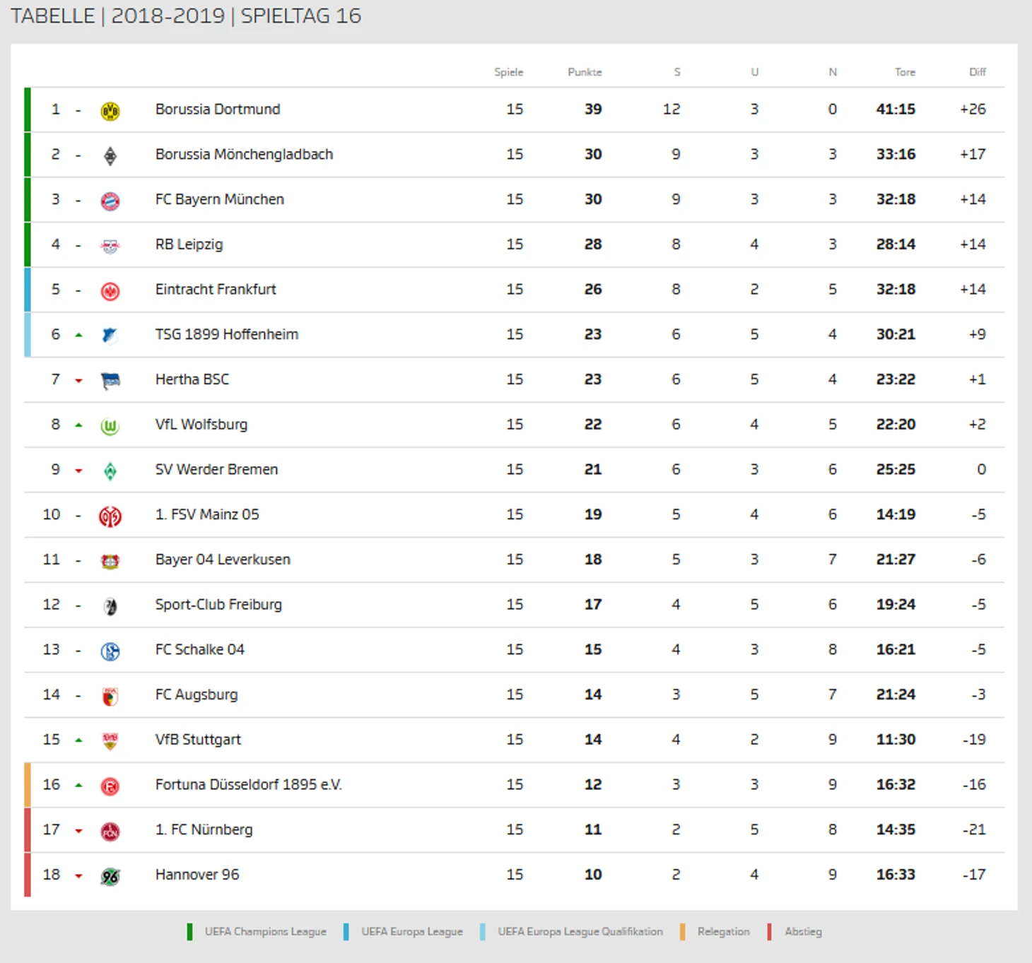 Турнирная таблица немецкой Бундеслиги после 15 сыгранных туров