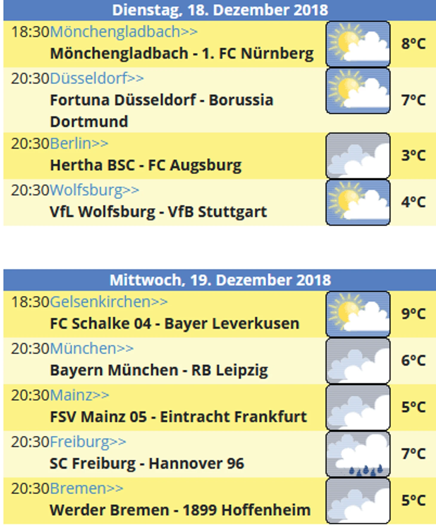 Самую жаркую погоду в матчах 16-го тура немецкой Бундеслиги синоптики обещают в Гельзенкирхене ( +9), а холоднее всего по их мнению будет в столице Германии – Берлине, там ожидается сразу на 6 градусов холоднее. Повлияет ли погода на игру команд?