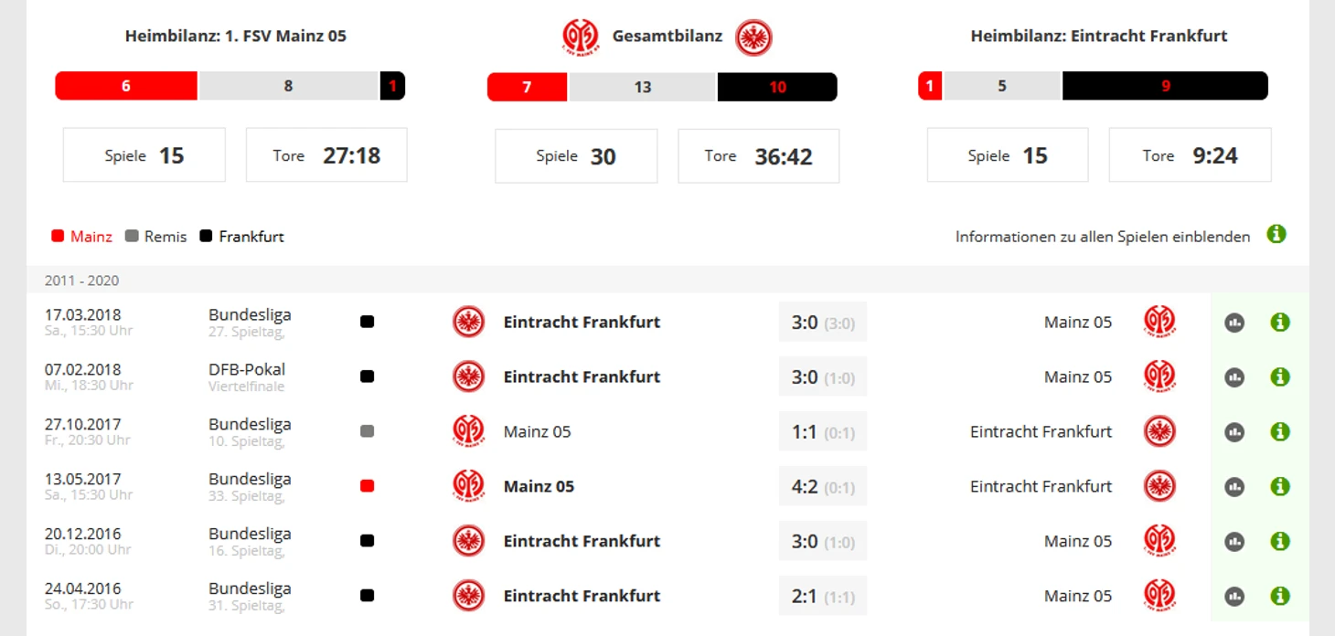 Франкфуртовский «Айнтрахт» в 16-м туре поедет покорять Майнц. Команда Адольфа Хюттера находится сейчас на 5-м месте в турнирной таблице и мечтает уйти на рождественскую паузу в заветной топ-4. Для этого «орлам» необходимо, как минимум набирать очки в матче против «карнвальщиков». «Майнц» хочет наконец-то порадовать своих болельщиков домашней викторией ведь в последних двух встречах команде этого сделать не удавалось. Сначала «Майнц» уступил «желто-черным» со счетом 1:2, а потом случилась совсем не запланированная осечка в игре против аутсайдера чемпионата «Ганновера»(1:1).