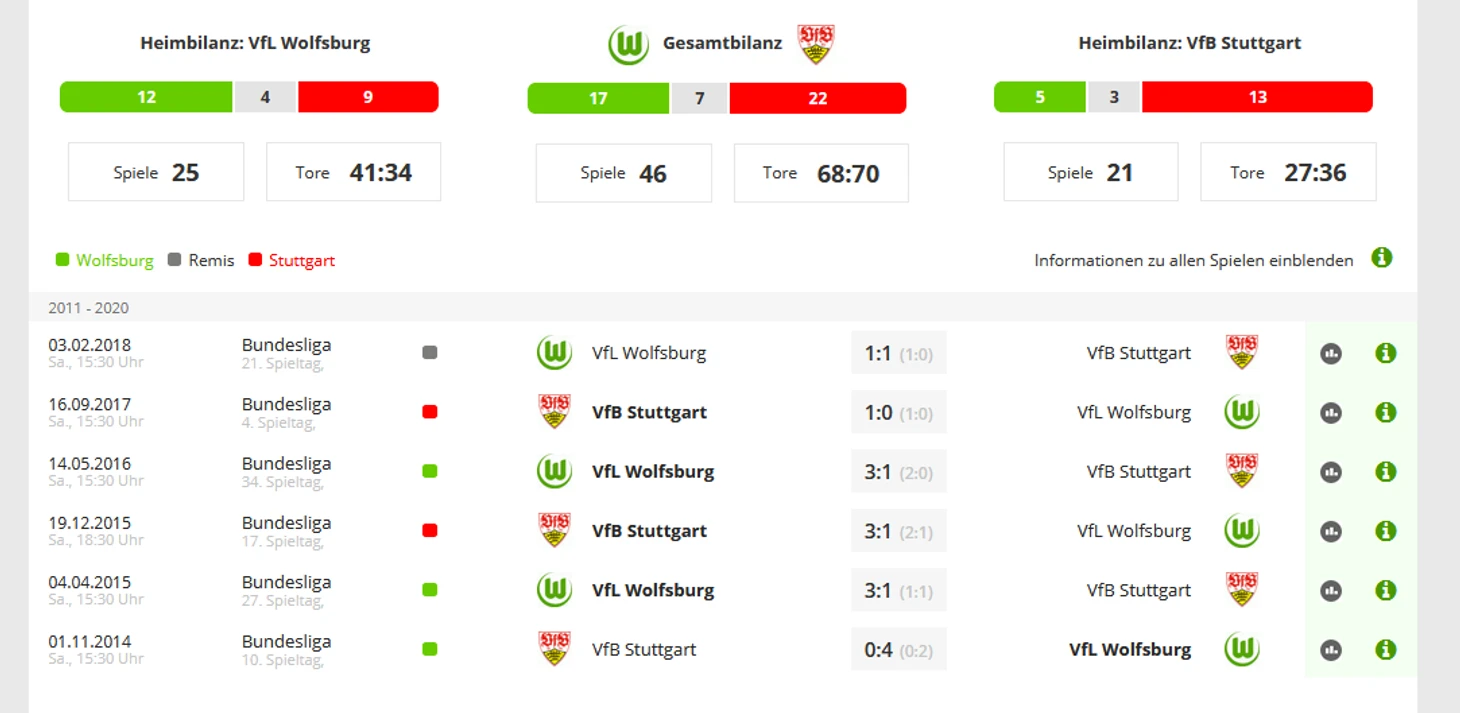 «Штутгарт» в 16-м туре отправляется в автогород, где сразится с местным «Вольфсбургом». «Швабы» не удачно провели свои 2 последних матча на выезде против «Байера (0:2), и «Боруссии» из Гладбаха (0:3). Более того против них и статистика очных матчей, где «Штутгарт» в последних трех выездных встречах неизменно забивал, но только однажды смог добыть лишь одно очко. «Вольфсбург» сейчас проводит отличную серию сумев набрать 10 очков в последних 4 матчах. Однако, упрямая статистика говорит, что не все так сладко у «волков». Если обратить внимание на показатели домашних матчей «Вольфсбурга», то откроется удивительная картина. Команда, которая всегда считается очень крепкой именно в родных стенах, на данный момент в турнирной таблице с учетом только домашних матчей лишь 16-я! Из 8 матчей «волки» одержали лишь 2 победы, правда последняя пришлась на грозный «РБ Лейпциг» (1:0).