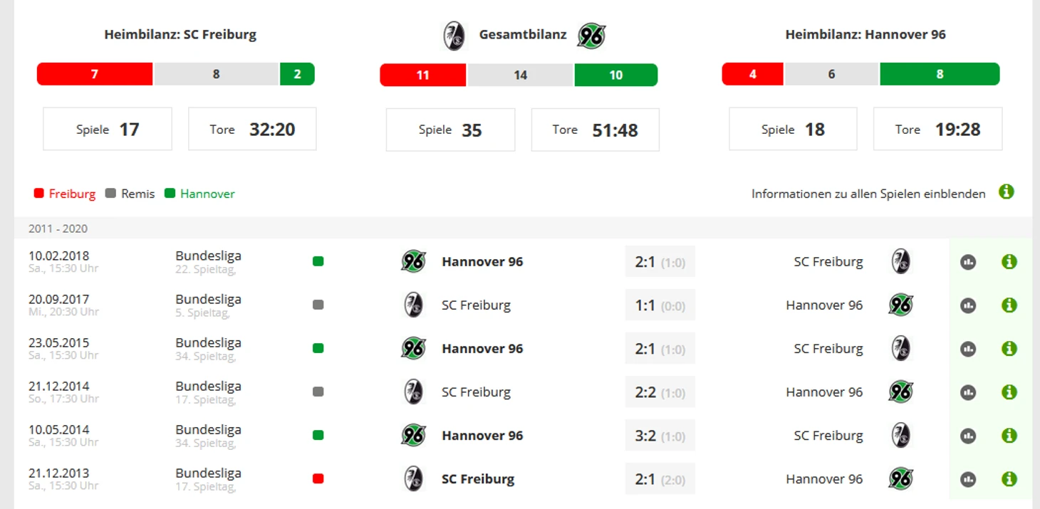 «Ганновер», который сейчас находится на последнем месте в турнирной таблице, отправится в 16-м туре покорять Фрайбург. В планы «черно-белых» явно не входит терять очки на родном стадионе. Хотя, не так давно «Фрайбург» неожиданно уже уступал на «Шварцвальд-штадионе» «Майнцу» со счетом 1:3. «96-е» наоборот сумели в гостях сыграть с «карнавальщиками» в ничью (1:1). За 8 матчей команде под руководством Андре Брайтенрайтера удалось набрать лишь 3 очка в гостевых поединках. Более того, в предыдущем туре по «Ганноверу» катком на домашней арене проехалась «Баварии», разгромно обыграв "96-х" со счетом 4:0.