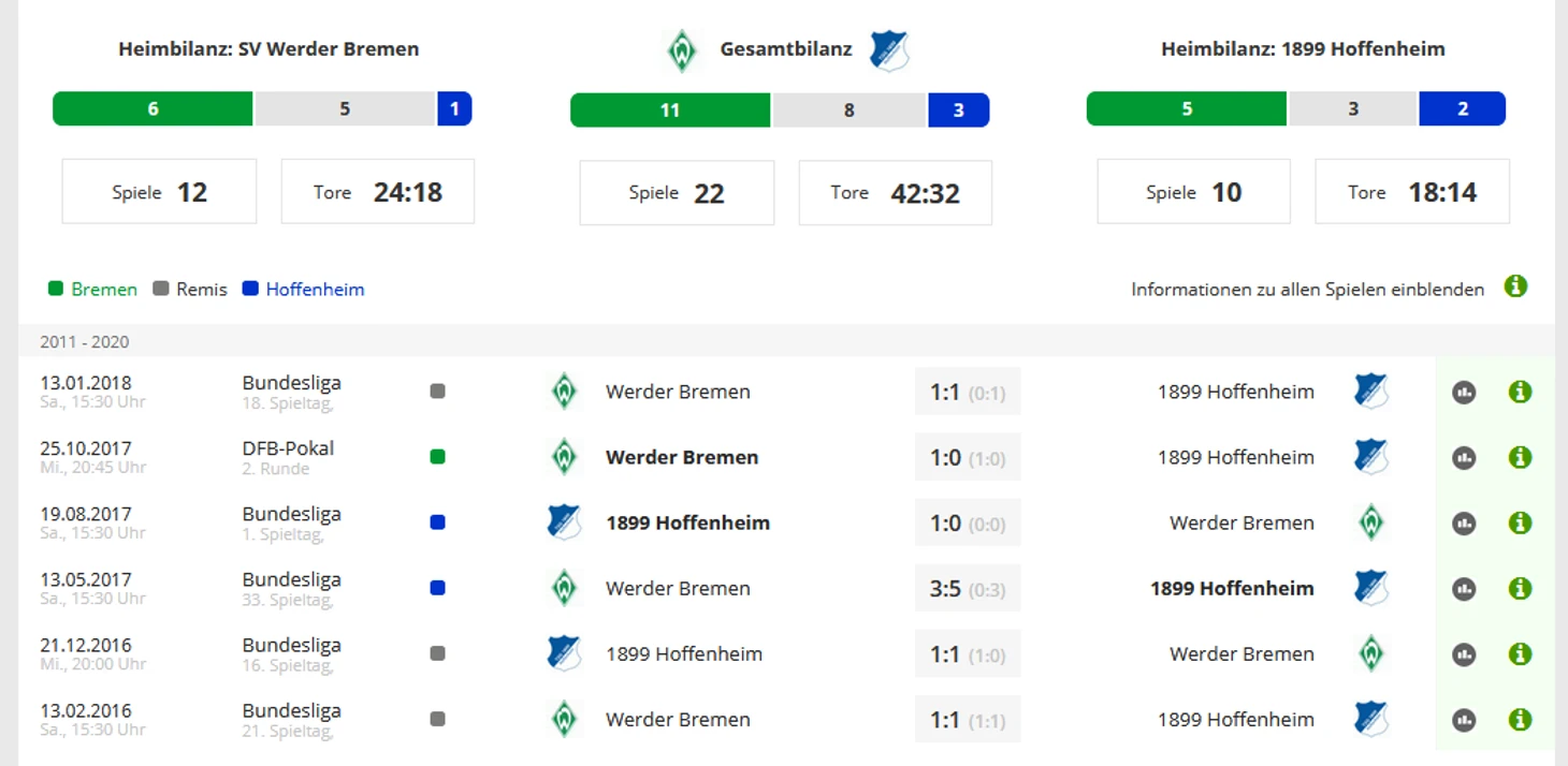 На «Везерштадионе» состоится еще один очень любопытный матч. В гости к «бременским музыкантам» приедет забивной «Хоффенхайм». Последние две гостевые игры «сельчан» завершились крупными ничейными исходами (матч против «Герты» - 3:3, а против «Вольфсбурга» - 2:2). «Вердер», который, потрясающе стартовал, дав своим болельщикам надежду на возвращение славных времен клуба, начал очень сильно буксовать. Причем – это связано, как раз с играми на родном стадионе. Все события «не по плану» начались с матча против «Байера», который сталкивался на футбольном поле с большими трудностями в тот период. Однако, подопечные Флориана Кохфельдта уступили "аспиринщикам" с разгромным счетом 2:6, а потом проиграли еще две важные встречи против команд из лидирующей группы, Сначала Гладбахской «Боруссии» - 1:3, а затем «Баварии» - 1:2. В эти выходные «Вердер» потерпел гостевое поражение, на этот раз в Дортмунде и снова со счетом 1:2. Команда опустилась на девятую строчку турнирной таблицы.