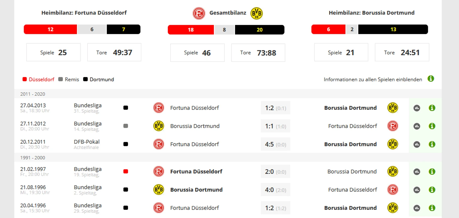 На протяжении очень длительного периода времени «Фортуна» и «Боруссия» не играли друг против друга. Последнее противостояние состоялось в Дюссельдорфе более, чем 5 лет назад. Тогда «Фортуна» уступила «шмелям» со счетом 1:2. А в поединке на Сигнал Идуна Парк и вовсе сумела вырвать ничью. Расклады перед этим матчем для хозяев намного печальнее, чем события того времени. «Боруссия» набрала какой-то нереальный ход и сметает всех своих конкурентов с пути. Отрыв дружины Люсьена Фавра от «Баварии» достиг 9 очков и дортмундцы рассчитывают, как минимум сохранить этот гандикап до рождественской паузы. Однако, хорошая новость для болельщиков «Фортуны» заключается в том, что «желто-черные» играют параллельно в Лиге Чемпионов, а это означает, что нагрузка на футболистов основного состава увеличивается в разы. Более того, «Боруссия» в последних матчах редко кого-то громит, как это было на старте сезона.