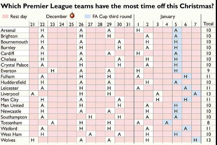 Меньше всех дней отдыха будет в этот период у "Тоттенхэма" (8).