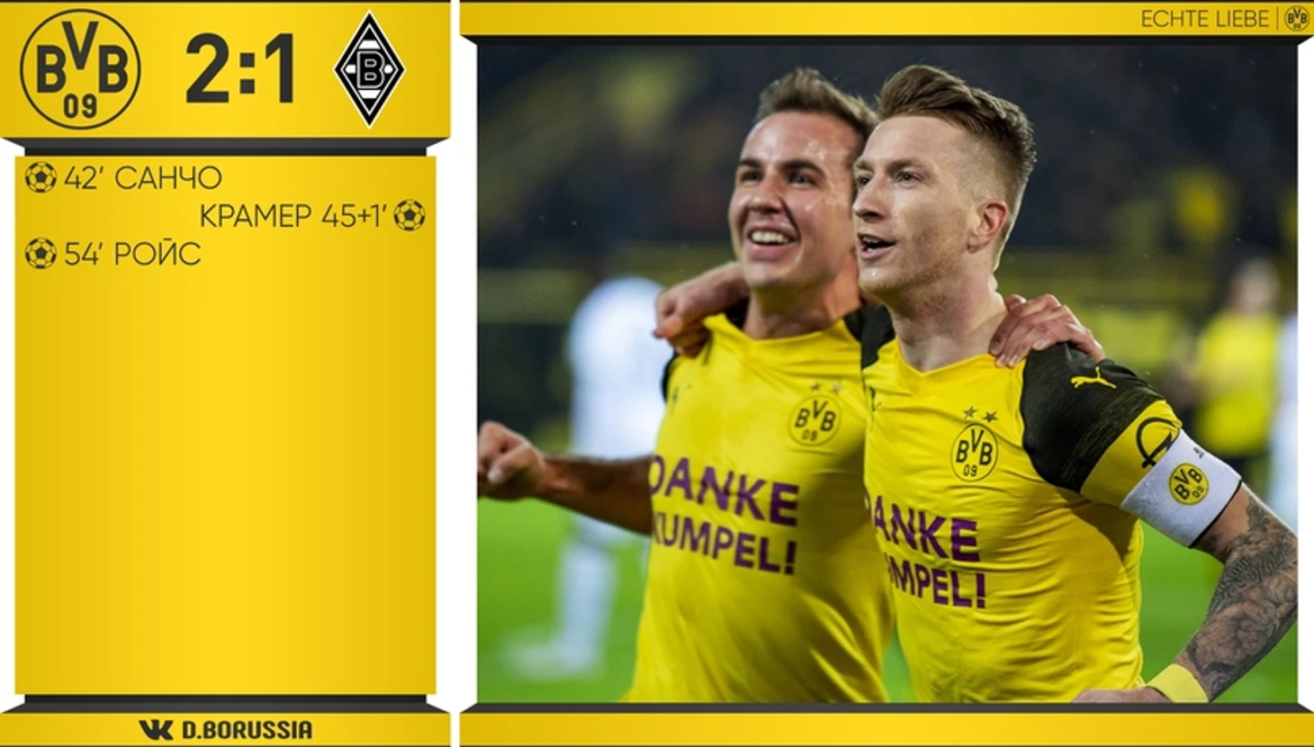 Для того, что бы отыграться Глагбах не создал чего-то внятного. А вот Дортмунд мог и увеличить счет, но Ройс угодил в штангу со штрафного.