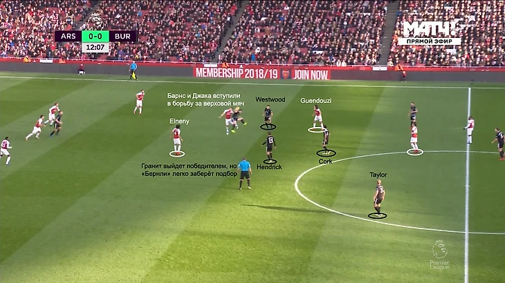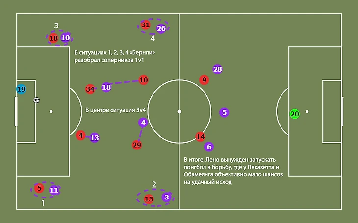 «Бернли» тоже высоко встречал соперника, вчетвером организуя высокий прессинг, а при попытках Лено сыграть средней передачей верхом, Ми и Лонг выдергивались за оппонентами за линию радиуса. Но самое крутое происходило при розыгрышах «Арсенала» от ворот: центральных защитников, располагавшихся на флангах у своей штрафной, «Бернли» разбирал 1v1, Джаку и Эль-Ненни, опускавшихся к воротам Лено по центру – аналогично, по высоко расположенным фулбэкам действовали Бардсли и Тэйлор. Озил и Гендузи пытались открыться чуть выше Джаки и Эль-Ненни, и по их движению играл Корк (обычно англичанин располагался ближе к французу, так как Озил «открывался» пешком, и его успевал перекрывать Вествуд, заодно державший также слабого в движении без мяча Джаку). В результате Лено был вынужден запускать лонгболы на Ляказетта и Обамеянга, находившихся в численном меньшинстве 2v3. Габонец и француз не выиграли ни одного верхового единоборства за матч при девяти (4+5) попытках. Мощный ход.