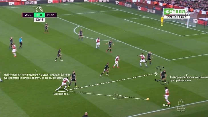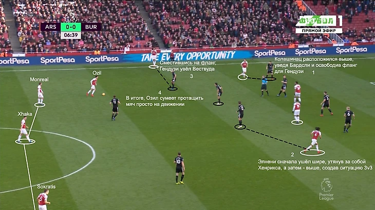 Также был вариант с обменом позициями Джаки и Эль-Ненни: в таких эпизодах египтянин тащил мяч между линиями на силовом дриблинге (Гранит двигал владение через передачи) и, разбив mid-прессинг «Бернли» и отдав на Джаку/Озила, уходил на одну линию с нападающими, создавая впереди равенство 3v3.