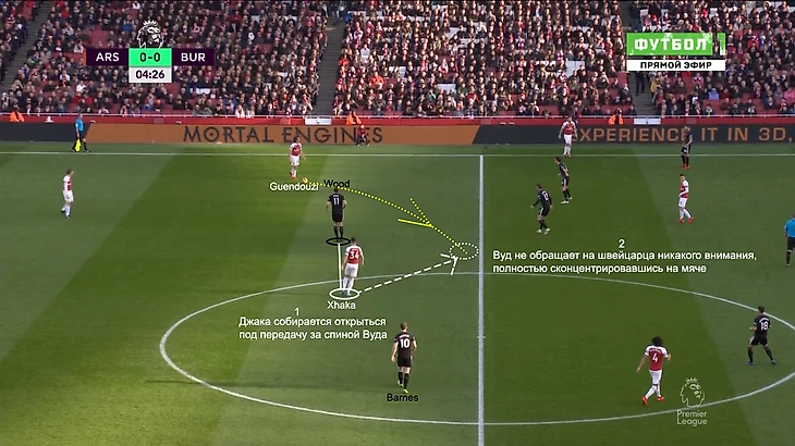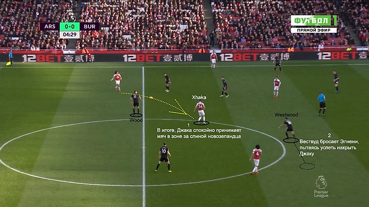 «Арсенал» продвигает мяч через левый фланг: Джака, попав под прессинг Вуда, отдает на Гендузи. Новозеландец тут же переключается на француза, хотя Гендузи – это игрок Хендрика, и о сопернике у себя за спиной больше не вспомнит.