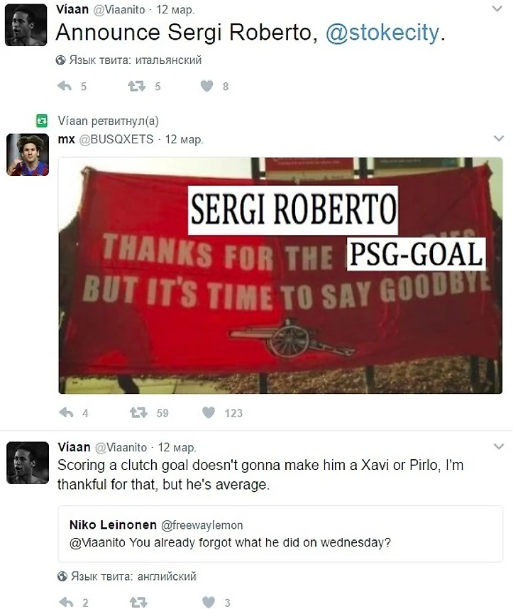 Думаете, ненависть к академии конечна и чем-то ограничена? А вот и нет, вот таким образом благодарные фаны радовали Серджи Роберто через 4 дня после того самого гола в ворота «ПСЖ»: «подпишите его, «Сток Сити»», «Серджи Роберто, спасибо за гол в ворота «ПСЖ», но настало время попрощаться» и «забитый важный мяч не сделает его Хави или Пирло. Я благодарен ему за это, но он средненький игрок». Скриншот был сделан два дня спустя, потому число ретвитов и лайков могло увеличиться.