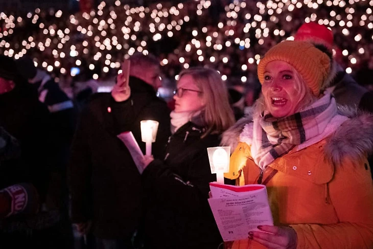 После небольшой задержки, стадионные прожекторы погасили, а вместо них зажглись рождественские свечи, что создало очень уютную и магическую атмосферу.