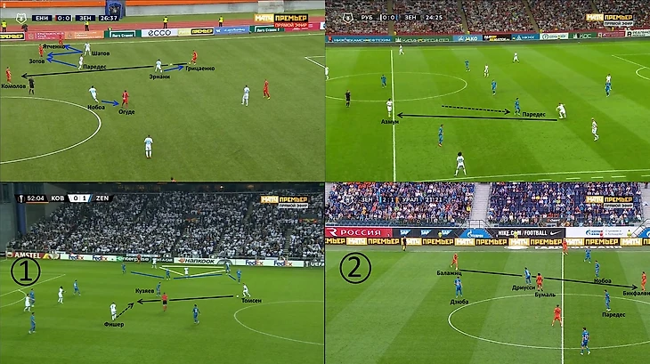 Из-за этого в некоторых матчах «Зенит» сбивался на забросы от первой линии билд-ап’а на группу атаки, открывавшуюся на грани офсайда.