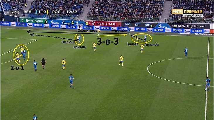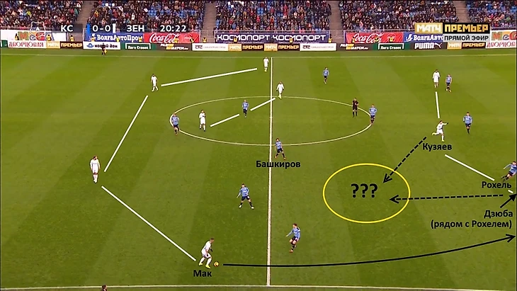 Центр же не использовался вообще (в позиционных атаках, конечно же), а через левую бровку так эффективно разыгрывать мяч не получалось, ибо там играл правоногий Мевля, а также Ерохин, который, как я уже отмечал, не так хорош для построения атак. Ещё после первого же матча, где данная расстановка была применена (против «Ростова»), стало понятно, что решение это разовое, поскольку соперник слишком уж легко после проваленного старта нейтрализовал «Зенит» в атаке на оставшуюся часть игры именно из-за того векторного однообразия в билд-ап’е. Впрочем, конкретно против «Ростова» этого хватило для победы, ибо в атаке коллектив Карпина не так хорош.