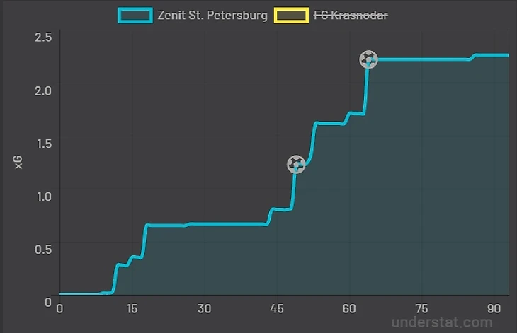 В итоге, «Зенит» сыграл свой худший матч в РПЛ, несправедливо победил, уступив по xG в 2 раза (0,54 против 1,16).