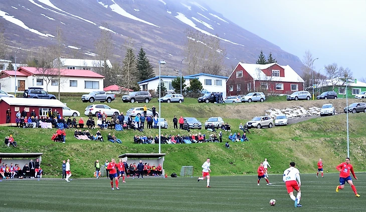 Я рискнул и пошёл назад по крутой, зигзагообразной тропинке, тянущейся от поля к клубному офису, чтобы отогреться там горячим кофе, ибо температура всё понижалась и понижалась. Тем временем, Бьярни вместе с местным чиновником занимались установкой колонки на треножник, и уже через пять минут музыка эхом разнеслась по заснеженному фьорду. Уникальное окружение помогает прочувствовать душу исландского футбола: яркие цветные крыши домов, которые можно встретить по всей стране; огромные противолавинные сооружения, оберегающие горожан от опасности, нависшей прямо над их головами, и расположенные буквально в нескольких метрах от поля; удивительно острые горные вершины, напоминающие зубы фронтмена «The Pogues» (прим.- знаменитая ирландская панк-группа) Шейна МакГоуэна! «Football porn» – этим ёмким словосочетанием я могу описать происходящее вокруг, и именно ради этих красот и впечатлений я уже много лет путешествую по низшим лигам. Постепенно начинают прибывать болельщики.