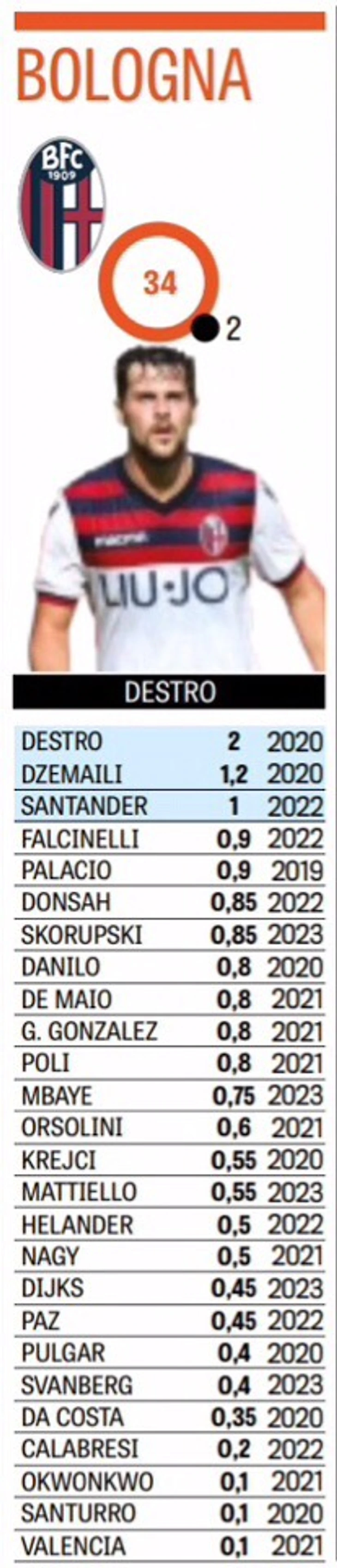 Группа атаки «Фельсинеи» - одна из худших в Серии А (лишь 15 забитых голов, меньше только у «Фрозиноне» и "Кьево"). Основная пара форвардов – южноамериканский дуэт: Федерико Сантандер и увядающий ветеран Родриго Паласио. Сантандер, один из самых популярных игроков Парагвая и друг президента этой страны, является самым результативным игроком «Болоньи» в сезоне (5 голов). Его важность для команды колоссальна. Это мощный, танкоподобный (а, скорее, шкафоподобный, отчего и прозвище: El Ropero – шкаф) и колоритный форвард, отчаянно ведущий верховую борьбу (аж 6,7 выигранных воздушных единоборств за матч) и больше всех в составе угрожающий воротам соперников (2,7 удара за игру). Трансфер Сантандера пока оправдан, однако тот же Чиволани считает его «одним из слабейших нападающих клуба за всю историю». Партнер парагвайца, почти 37-летний Паласио, чаще всех в «Болонье» пускается в дриблинг (1,8 успешных попыток) и хорош в подыгрыше, но с результативностью все скверно: лишь 1 забитый гол. Игроки подмены – это Диего Фальчинелли, Оржи Оквонкво и Маттиа Дестро. Фальчинелли много перемещается по всему фронту атаки, но в остальном он практически бесполезен. К сожалению, яркий сезон в «Кротоне» двухгодичной давности, по всей видимости, - это единственное светлое пятно в карьере этого нападающего. Оквонкво из яркого и забивного джокера превратился просто в скоростного и бестолкового джокера, а Дестро, несмотря на громкие летние заявления о «возвращении», не используется Индзаги почти совсем, сыграв в стартовом составе лишь дважды в сезоне.