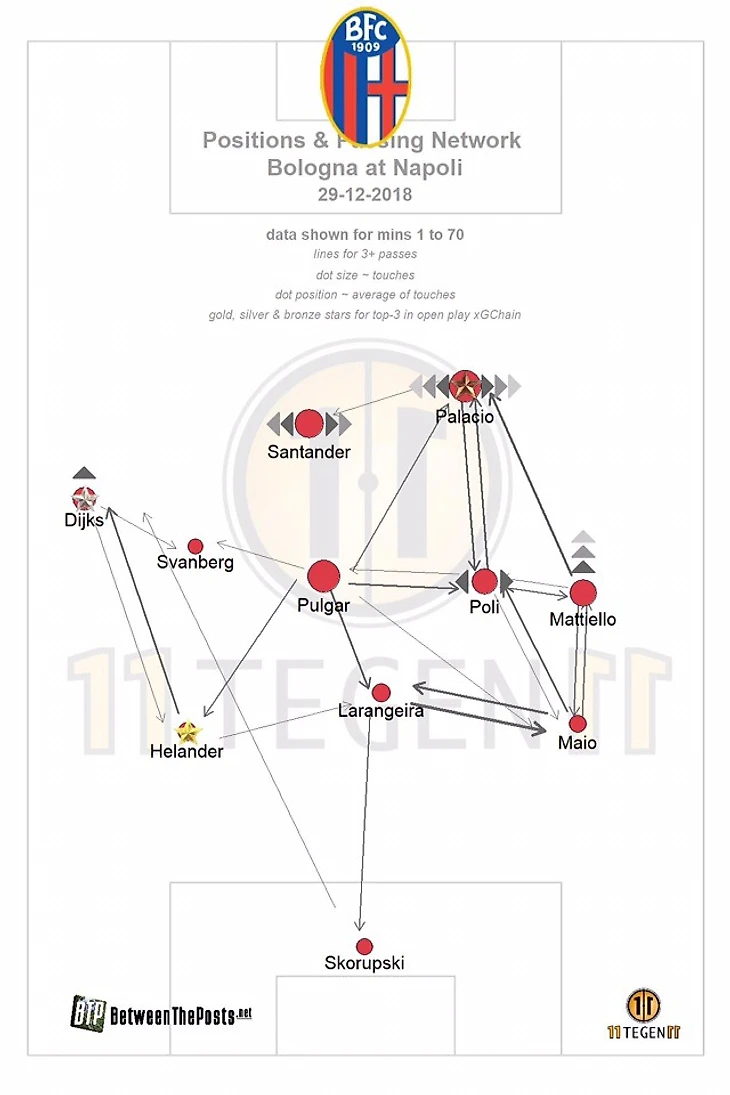Тактика «Болоньи» очень хорошо раскрыта на этой диаграмме. Обратите внимание на плеймейкинг вратаря Скорупски: жирнющая линия на выдвинутого центрфорварда (Сантандер) показывает, что один из основных распасовщиков команды – ее собственный страж ворот.