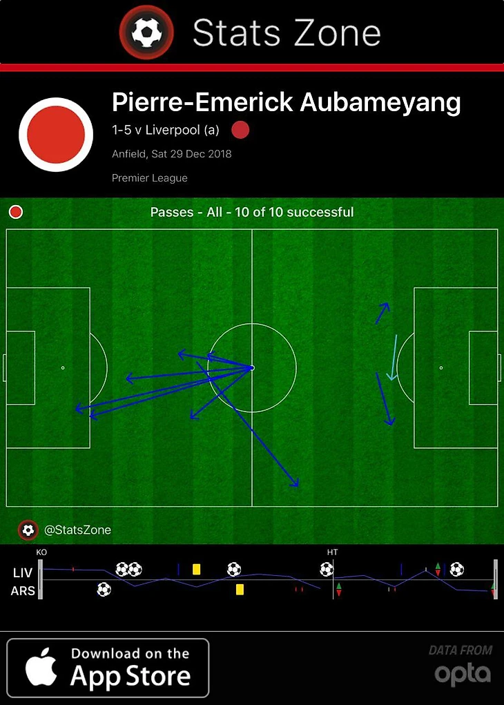 Обамеянг 10 раз коснулся мяча в матче с «Ливерпулем». 6 раз в центре поля