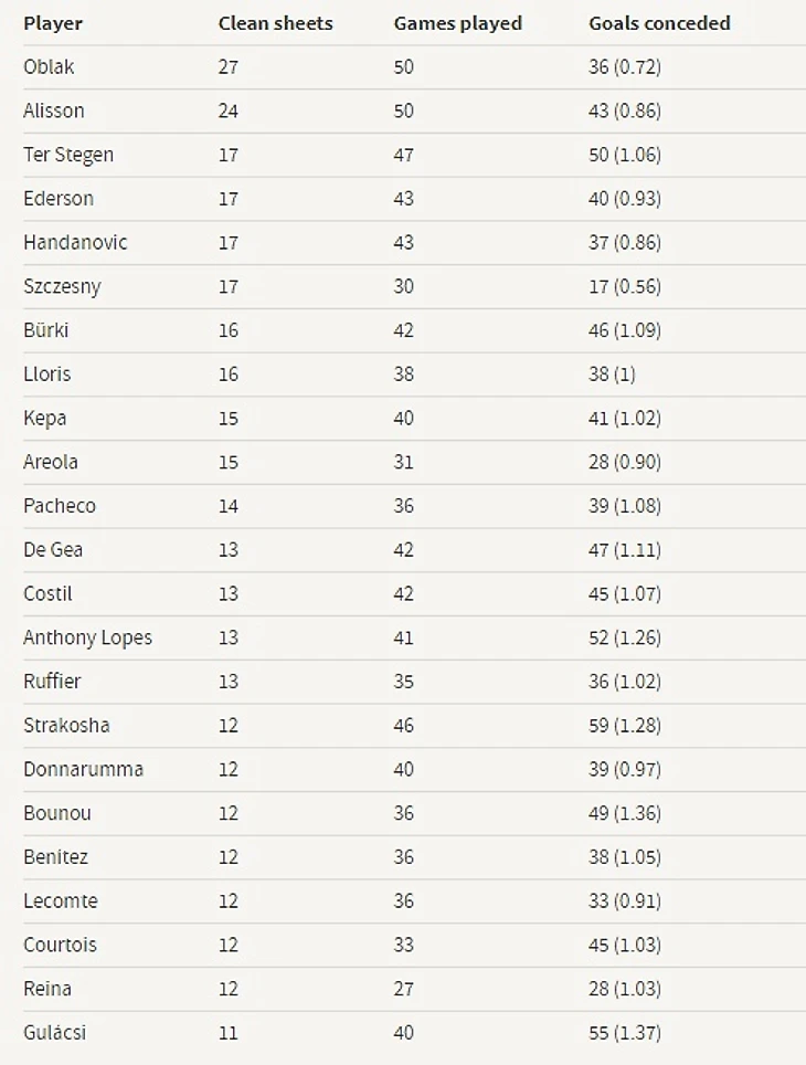 Лучшие вратари 2018 по количеству «сухих матчей». Облак, Алиссон, Штеген