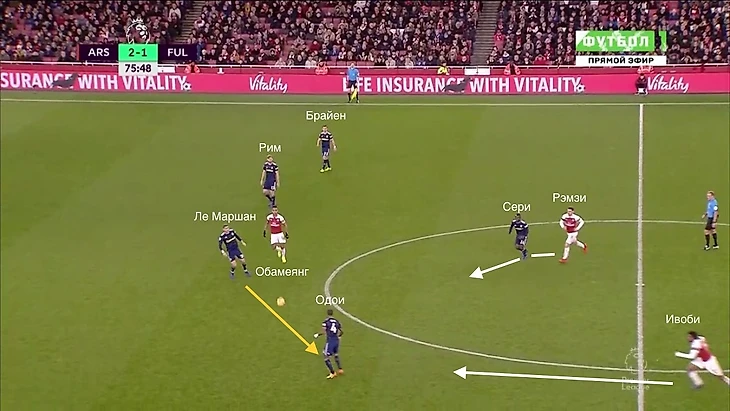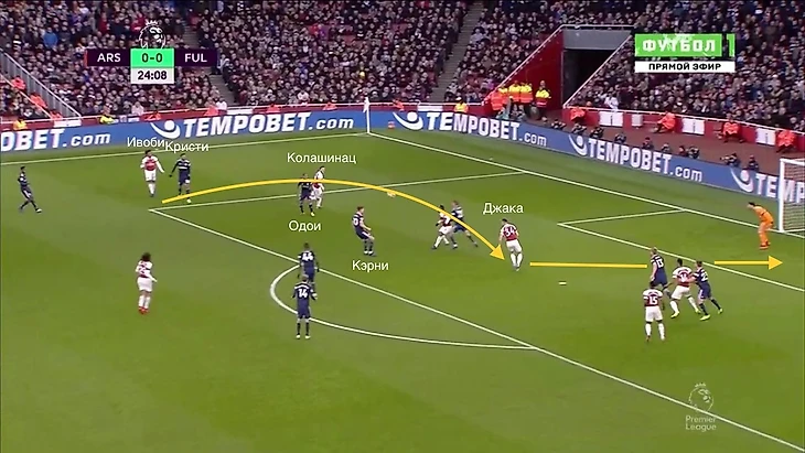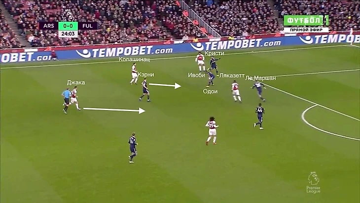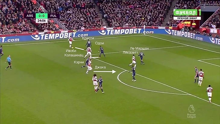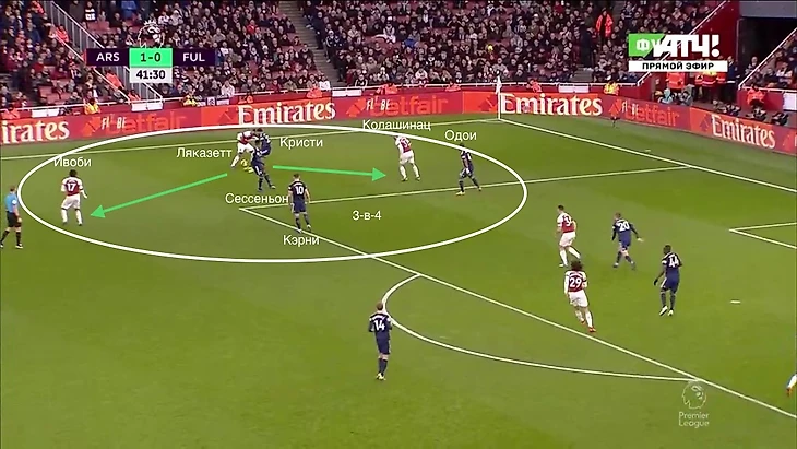 Даже несмотря на то, что у "канониров" практически не получалось получать чистого количественного преимущества, игроки Эмери все равно постоянно создавали моменты из этой зоны. Часто это происходило из-за позиционных ошибок игроков "Фулхэма". Они могли вдвоем опекать одного игорка "Арсенала", легко выдергивались с позиций, могли недорабатывать эпизод.