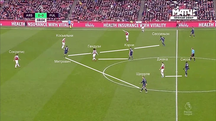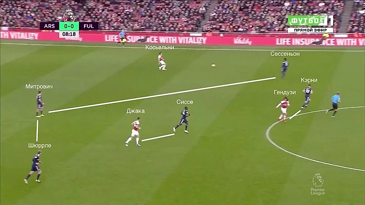 Прессинг у "Фулхэма" был практически стандартный: структура 3-2, средний блок, подключения латералий на флангах. В особенности же можно отнести то, что вторая линия прессинга персонально следила за полузащитниками "Арсенала". Куда бы не двигались Джака и Гендузи, за ними по пятам следовали Кэрни и Сиссе.