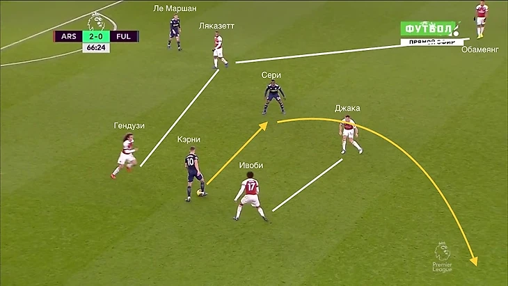Центральные полузащитники "Фулхэма" сначала поднялись с Джакой и Гендузи, а потом с ними и опускаются.