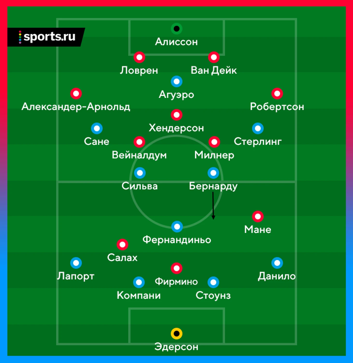 1. Главным сюрпризом в составе Гвардиолы стали фланговые защитники: cправа Данило вместо провалившего декабрь Кайла Уокера; слева номинальный центрдеф Эмерик Лапорт. После игры Пеп пояснил, что этот ход был в первую очередь оборонительным – он выпустил того, кто максимально надежно сыграет против Мохамеда Салаха. Полузащита и атака легко угадывались. Интрига сводилась к потенциальному возвращению Кевина де Брюйне – его готовности хватило только для скамейки.