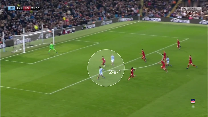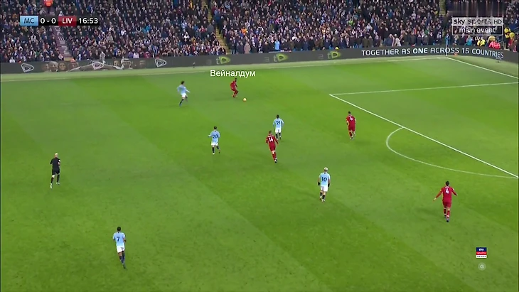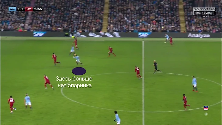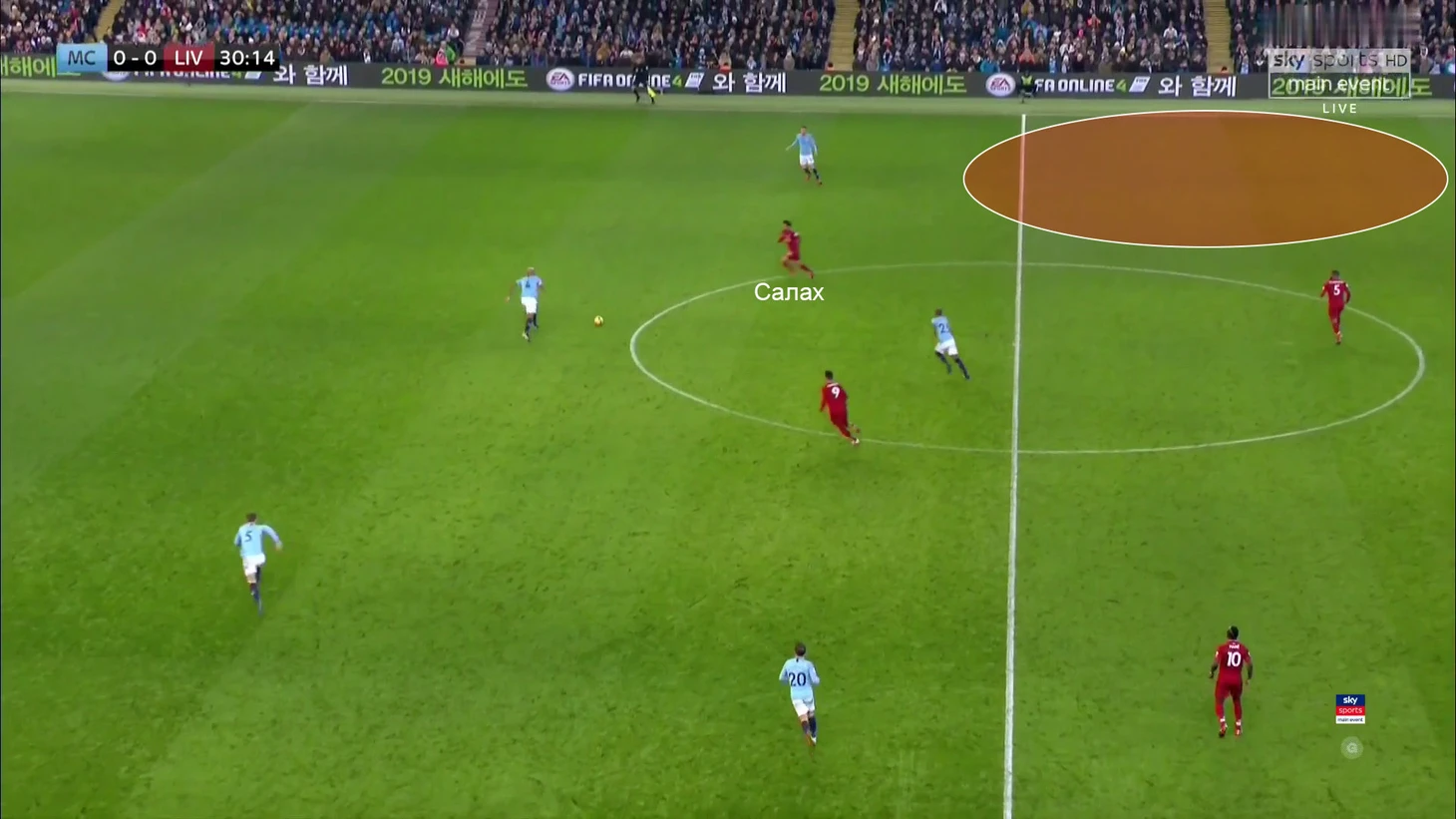 Фланг оставался свободным – по возможности его страховал Вейналдум. Ход сыграл в обе стороны. «Сити» получил какую-никакую опцию для атак (находившийся на этом же фланге Лерой Сане был самым активным и чаще остальных атакующих игроков получал мяч), но «Ливерпуль» почти организовал удаление для Венсана Компани – Салах оказался в нужной позиции для перехвата именно из-за описанного маневра.