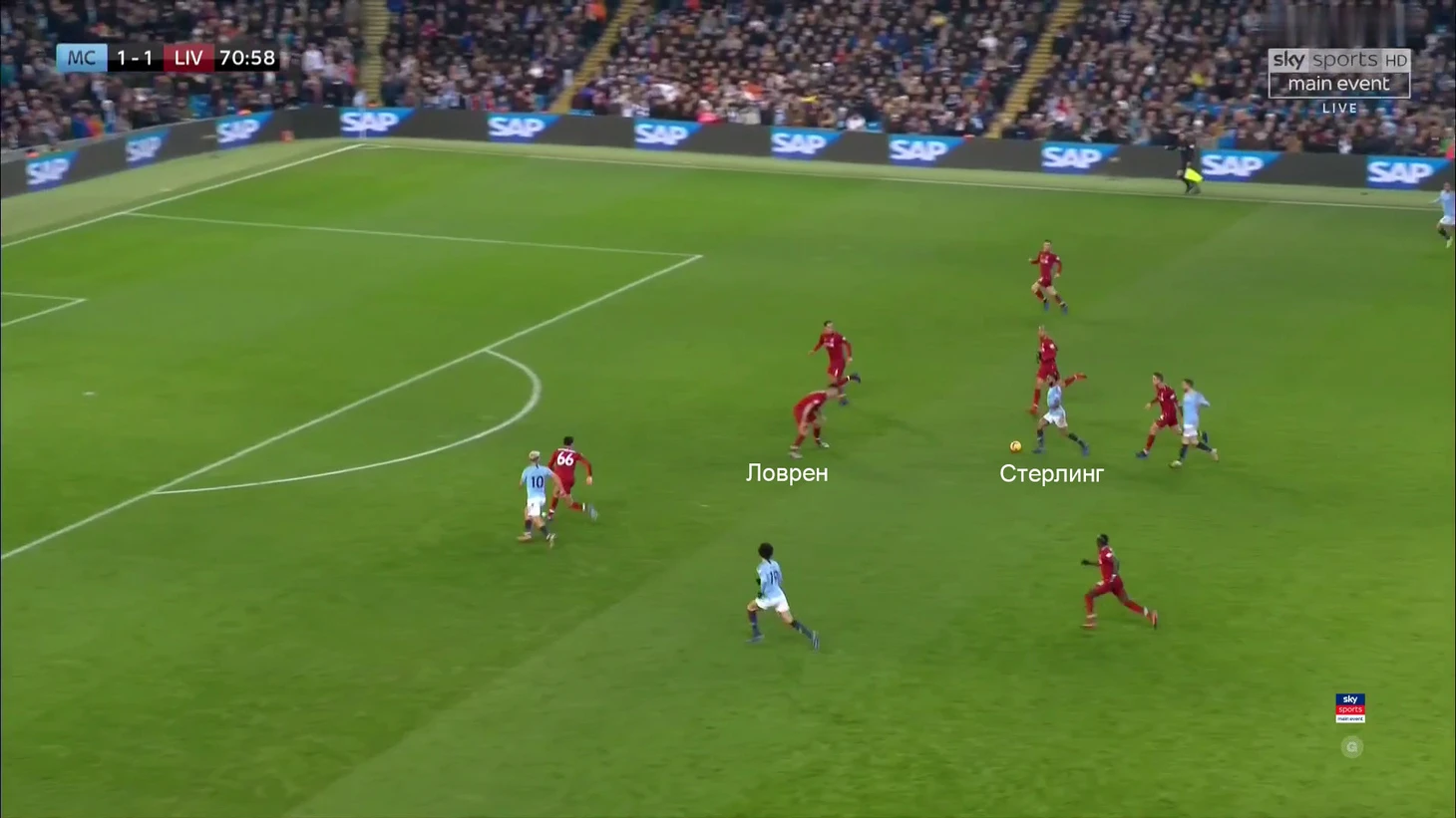 Стерлинг легко проходит сквозь опорную зону. Это вынуждает Ловрена реагировать и выдвигаться, чтобы не позволить Стерлингу отдать вразрез на Агуэро.
