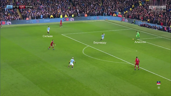 Уверенно разыгрывая мяч под давлением почти 30 секунд, «Ливерпуль» выманил в прессинг максимум игроков соперника, включая центральных полузащитников – Бернарду и Давида Сильву. Алиссон сохраняет спокойствие под прессингом и находит свободного Робертсона на фланге.