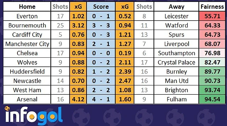 Самым несправедливым (с точки зрения модели xG) результатом стало домашнее поражение "Эвертона" от "Лестера" со счётом 0-1.