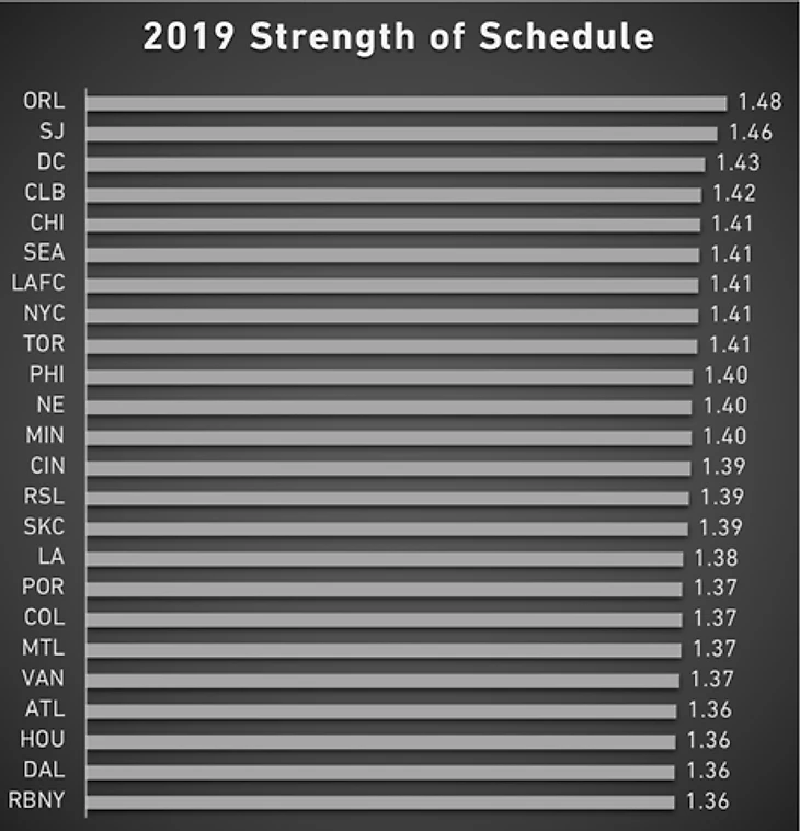 Самый сложный график у Orlando, а самый простой у RBNY. Это неудивительно. Ведь ньюйоркцам не надо играть с прошлогодними чемпионами, а Orlando не сможет набрать очки в матчах со слабейшей командой прошлого сезона.
