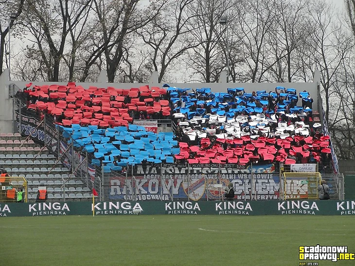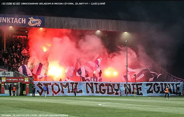 Матч І-ой лиги «Стомиль» - «ЛКС». Ольштынцев уже несколько лет преследует финансовые проблемы, однако клуб продолжает выступать во втором по силе дивизионе. Баннер «Стомиль никогда не умрет» с пиротехникой.