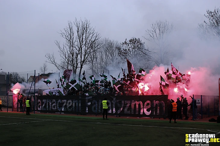 В начале декабря прошел принципиальный матч между «Ракувом» и «Одрой». Гости с плашками в цветах своего клуба.
