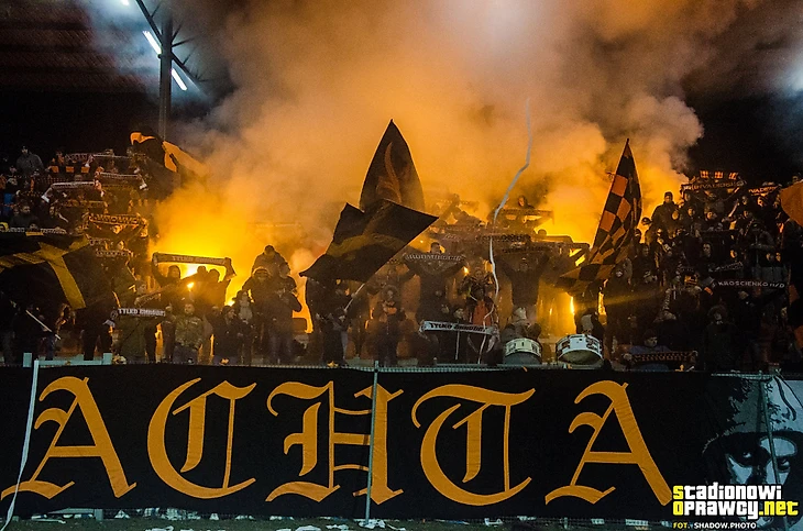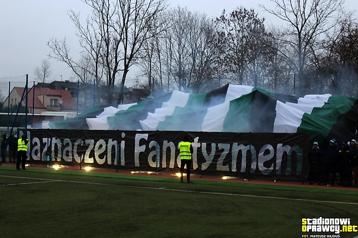 Фанаты «ГКСа» из Бельхатува на выезде в Ченьстохове c баннером «Намеченные фанатизмом», секторувкой в цветах клуба, флагами и пиротехникой.