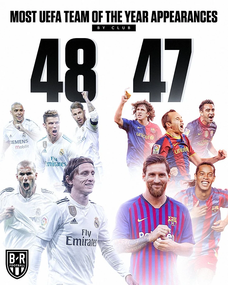 «Реал» обгоняет «Барселону» по количеству игроков попадавших в команду года УЕФА